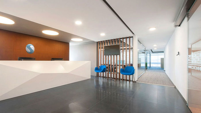 前臺的設(shè)計:在設(shè)計師眼中前臺是客戶了解企業(yè)的第一個窗口,故此一定要簡單、便捷,這也是設(shè)計師對金融公司辦公室前臺的基本定義,這樣的目的就是希望,讓客戶以最快的速度對企業(yè)有一個直觀的了解,暢通無阻的動線是保證客戶與企業(yè)之間交流的重要通道。