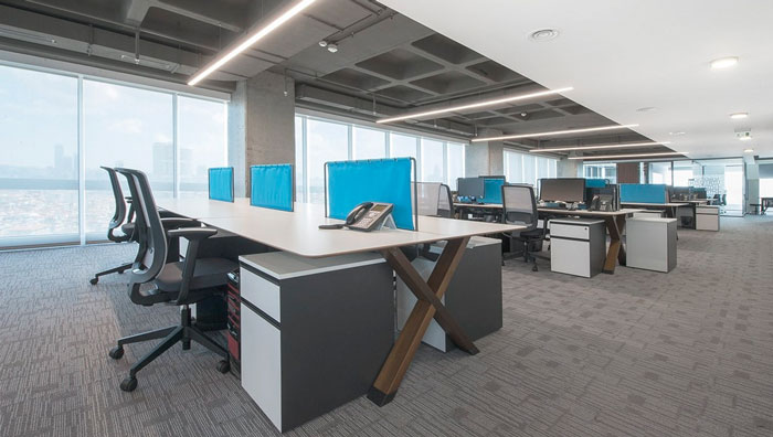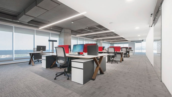 辦公區(qū)域的設(shè)計:設(shè)計師在打造辦公室的同時,也在強調(diào)室內(nèi)與室外之間的聯(lián)動,在設(shè)計師看來復(fù)雜的金融對于每一位員工來說,長期都會讓人感到心力交瘁,這也是極簡設(shè)計受歡迎的原因,因為簡單的空間本身就擁有抵消復(fù)雜的效果,一線江景的引入也是為了給員工營造一個輕松、舒適的辦公空間。