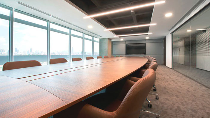 會議室的設(shè)計:整個會議桌呈橢圓式分布,幾乎占據(jù)了整個空間的中心區(qū)域,這樣做也是為了滿足企業(yè)對于人數(shù)的需求,同時也是為了采用去中心的設(shè)計手法,在這樣的空間中思維與想法不會受到任何的阻隔,同時水景的引入,也給會議一種一往無前的暗示。