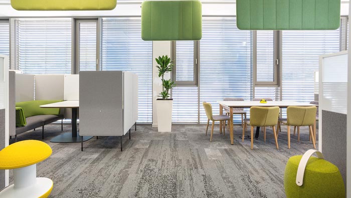 辦公區域的設計:設計師將辦公區域都安置在靠近窗戶的空間之內,這也是業主要求的,因為業主希望員工可以每天都可以感受到光、感受到外界的陰晴變化,設計師以白色為主色調,灰色地毯加以輔助,土黃色、木色、淺綠色加以點綴,讓實用與舒適達到極致。
