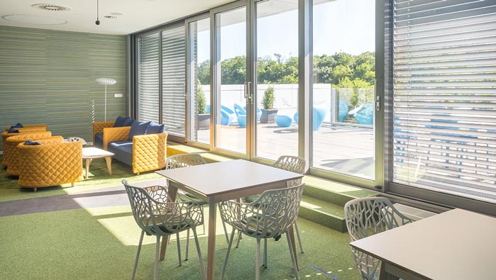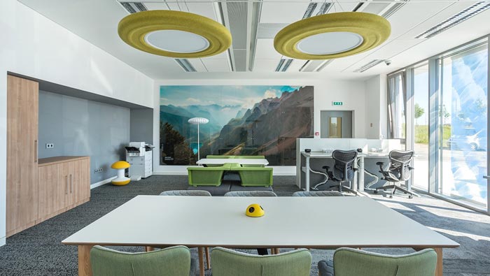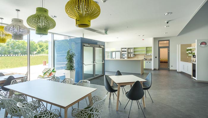 茶水間的設計:此處正對外界的草坪,陽光也明媚、充足,設計師希望給員工一個多功能的休息區域,既可以在室內品嘗咖啡,又可以在草坪上玩耍,設計師希望室內與室外之間的間隔,可以在這里打破,讓員工在辦公的中途,也可以接觸到外界的世界。