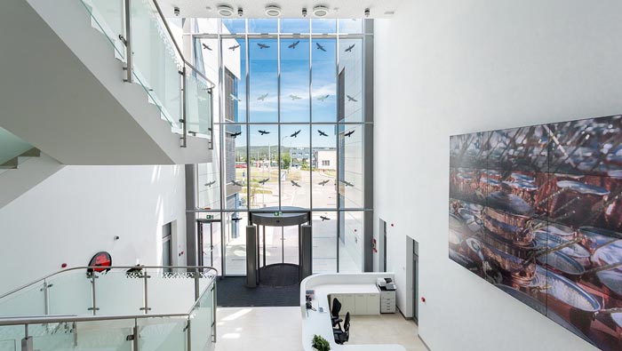 前臺大廳的設計:此處給人的第一感覺就是大氣、陽光,玻璃幕墻自上而下,將光透進空間的每一處區域,這樣設計的初衷就是為了讓客戶感受到企業的實力,正所謂佛靠金裝、人靠衣裝,萬物因為光而生長,設計師希望企業在光的見證下不斷的成長。