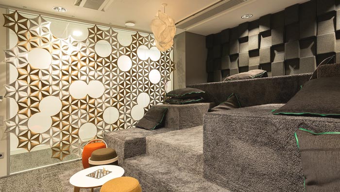 閱讀區域的設計:進入此空間有一個必要的動作就是脫鞋,因為這里采用的都是無菌的可躺臥的地毯,在這里員工可以根據自己的習慣,來調整看書的姿勢,同時這里也沒有吵鬧,給讀書營造了一個完美的空間,讀書使人成長,這也是企業希望看到的,企業希望人才可以不斷的自我成長。