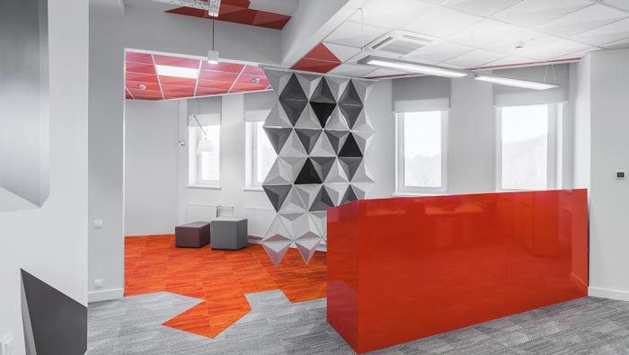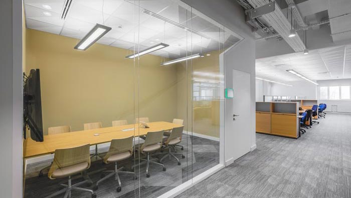 辦公區域的設計:此處是其中一個部門的辦公場地,設計師在辦公工位的設計中,將每一步部門按照不同的屬性分割在空間的每一個角落,這樣做好的好處就是保證為每一個員工都提供優質的辦公工位,不會出現人員扎堆的想象發生,即保證了空間的通暢也為每一個部門都保留了自己的空間。