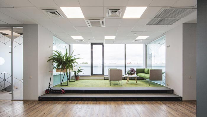 進門區域的設計:客戶進入后看到的一處生機勃勃的空間,這也這是設計師特意為之,在設計師看來不管是什么,第一印象都十分重要,故此設計師希望通過生機勃勃的進門區域,給客戶留下一個不錯的第一印象,同時生機勃勃也在一定程度上展示企業蓬勃發展的前景。
