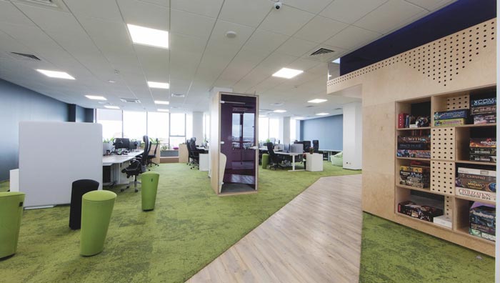 辦公區域的設計:在設計師看來辦公有時候就是在重復同一件事,這樣就很容易讓人有浮躁之心,在這樣的情況下,去除浮躁之心就是重中之重,這也是設計師采用綠色地毯的目的,設計師希望為空間營造一種童話的氛圍,讓員工在其中可以靜下心來認真的思考,理清自己的思路,如此浮躁之心自會消失。