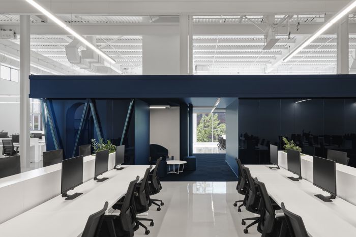 這是一個舊工廠改造成的辦公室,改造后共有兩層新的辦公空間,擁有1500方的面積設計師在空間中建造了一個體塊用來劃分空間,同時創造了一個休閑區域。