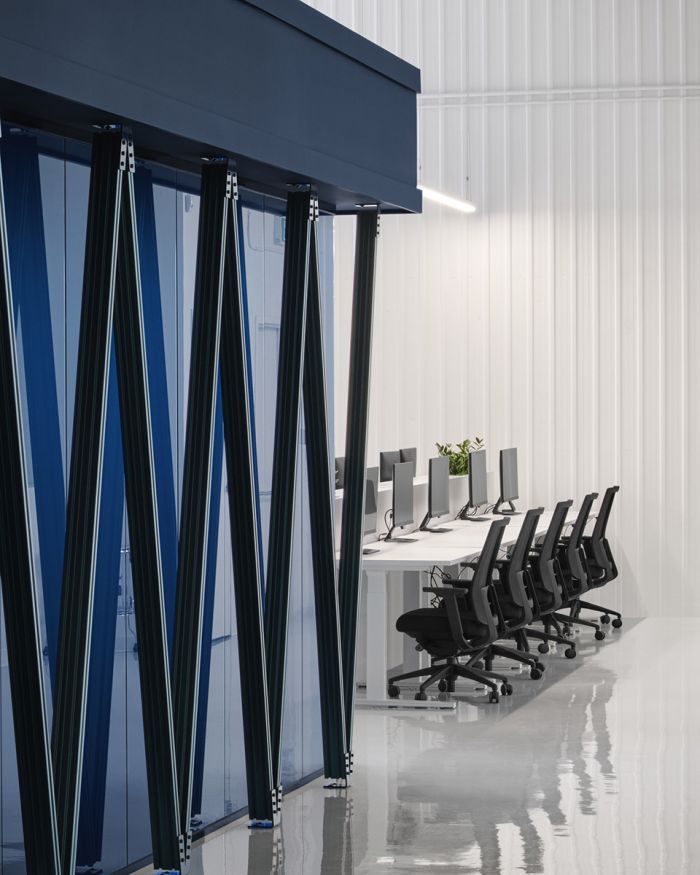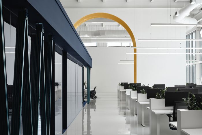 受到都市風格的啟發,工作和會議室類似于城市里的公共和娛樂空間。主體塊的一側設置了一道紀念性的拱門,另一側是一座適應性的地臺,可以用作前廳。連接兩層的結構將空間激活成為了一個間隙場所。