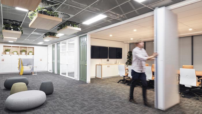 會議室的設計:推拉門是此處設計的亮點,當門合起來之后一個封閉的會議空間展現在大家的面前,以此保證會議的順利開展,當門開起來之后,內外空間結合在一起,為會議室增加了一絲活力,在這樣的空間下交流,更有利于問題的解決。