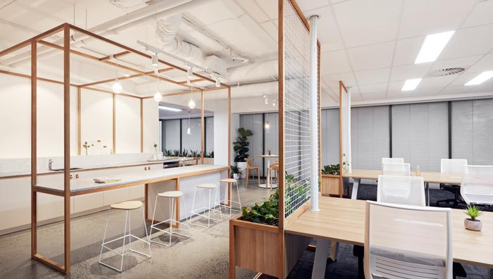 辦公區域的設計:辦公區域與茶水間、吧臺僅有一路之隔,設計師這樣設計的目的,一方面是讓各個空間之間的配合更加便捷,同時也希望員工在勞累之余可以在此次得以休息,坐在吧臺之上人的思維開放放飛,從繁重的壓力中解脫出來,休息就是為了更好的開始。