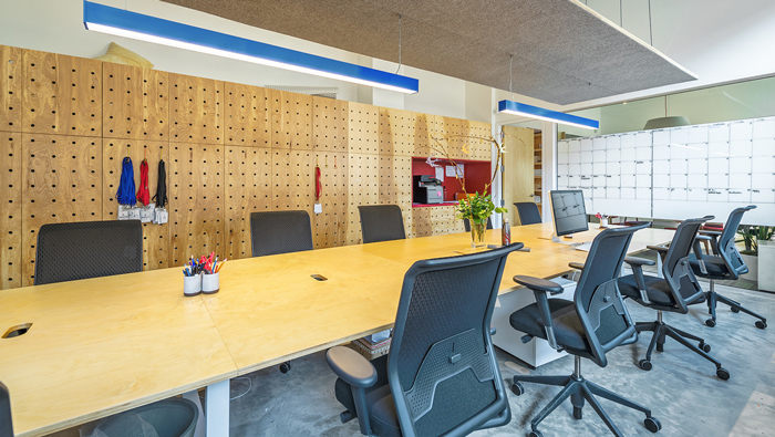 小型會議室的設計:我們首先看到的就是一個機關門,在外看是一個書架,往內推開卻是另有一番天地,這也是設計師設計中的一點點小趣味,在設計師看來趣味是辦公中的調劑,設計師希望員工在辦公中不是一成不變的,而是幽默、活躍、有趣。
