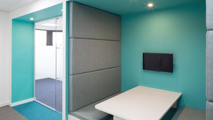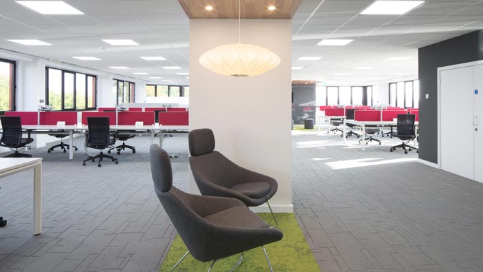 辦公交流區域的設計:設計師在設計中,絕對不放過每一個空間,在設計師看來設計就是要將空間開發到極致,此處就是最好的例子,設計師在此次設計的時候,發現空間由于柱子的出現,不得不被劃分為多個空間,但是設計師要做的就是有效的進行化解,最后設計師利用地毯與座椅將其打造成一個新的區域空間。