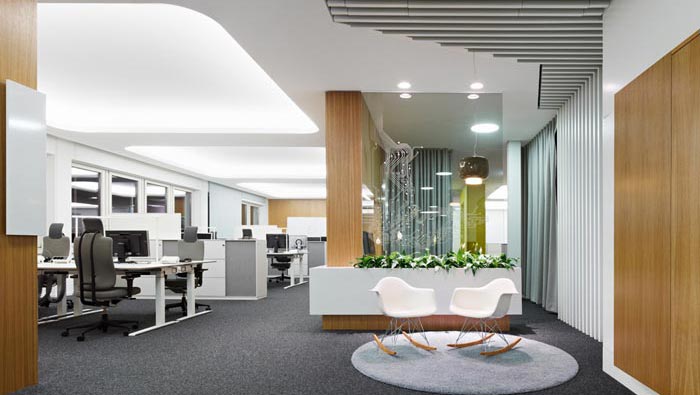 前臺區域的設計:設計師在設計的時候, 將其安置在空間的樞紐區域,在設計師看來前臺給人的第一感覺就是直觀與方便,讓客戶進入后可以一眼就對企業有一個大致的了解,不會出現捉迷藏的現狀,同時設計師采用軟裝對空間進行搭配與布置,這樣的好處就是最大程度的保留前臺的空間與保持空間的活力。