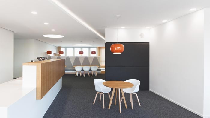 辦公區域的設計:設計師在設計的時候,在采用開放式辦公的同時,以儲存柜代替隔斷將每一個辦公工位進行隔離,在設計師看來這樣的設計可以有效的彌補開放式的缺點,同時讓空間看起來更加有層次感,儲藏柜的設置也很好的解決了空間容納的缺憾,真是一舉兩得。