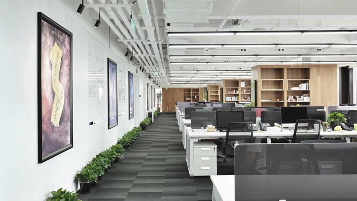 辦公區域的設計:設計師在設計的時候,對辦公空間采用開放式的設計手法,在設計師看來開放式的設計是現在的一個主流趨勢,同時設計師將每一個辦公區域都按照部門進行劃分,在每一個部門之間都放置儲藏柜,儲藏柜不僅可以起到容納的作用,同時也將兩個部門進行分離,這樣既可以保證空間的開放性又可以保證空間的私密性。
