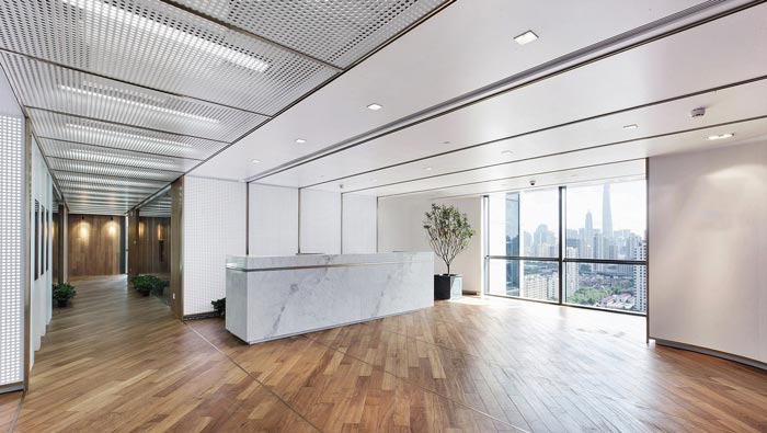 前臺的設計:設計師在設計的時候,以外部動線為起點、依次向內,在設計師看來前臺首先要解決的就是方便與便捷,故此設計師希望通過內外的相互連接,讓客戶可以自然而然的進入企業,這樣就很好的解決了渠道的問題,其次就是前臺區域坐落在落地窗的旁邊,陽光的投射讓客戶感受到企業的實力。