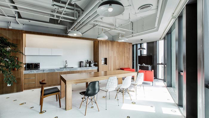 茶水間的設計:設計師在設計的時候,將其安置在空間的一個角落區域,此處呈三角形分布,設計師在設計中將茶水柜安置在空間三角的一條直線上靠墻分布,這樣的好處就是可以為空間留下足夠的使用空間,其中分布有休息桌椅、電視柜、沙發等,這樣可以讓員工在此地得以放松與歸零。