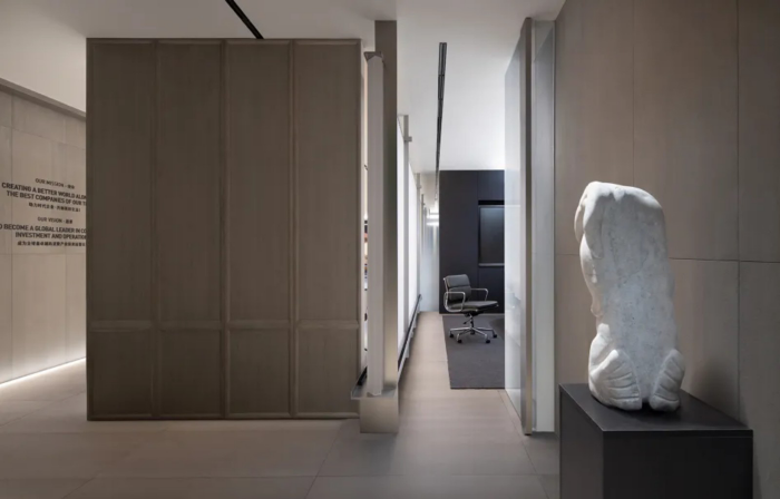 這間辦公室擁有500方的面積,業(yè)主是一家享譽業(yè)界的金融公司。設計師使用新中式的風格,展現了東方的視野,設計始終保有空間的溫和與優(yōu)雅。雕塑化的造型、理性的結構美、簡 雅的線條感,極簡的空靈和厚重的現實得以結合。