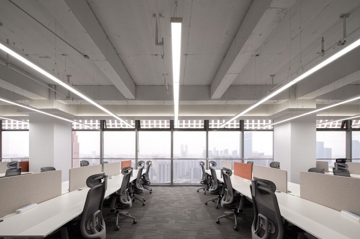 空間的一角設(shè)置有員工休息區(qū),員工可以在這個(gè)空間里休息和討論,桌椅的不同組合讓這個(gè)空間也可以作為大型培訓(xùn)的場所。空間內(nèi)有一個(gè)橙色的V字,是對空間原有建筑的延續(xù),使得整個(gè)空間靈動。