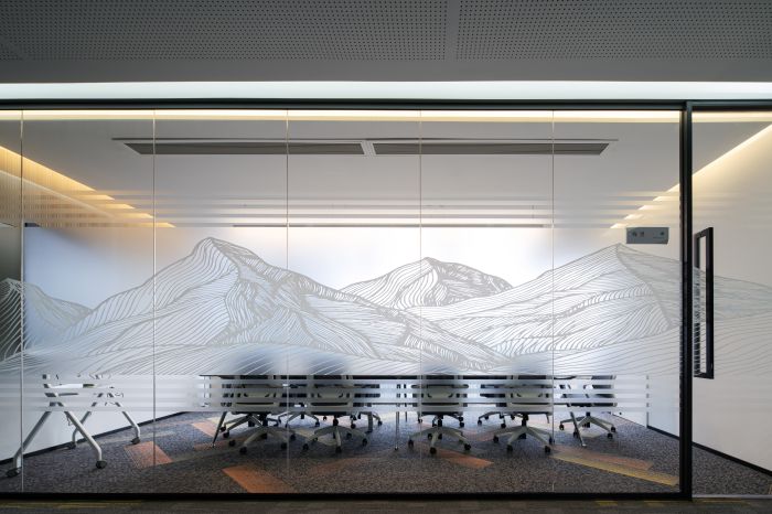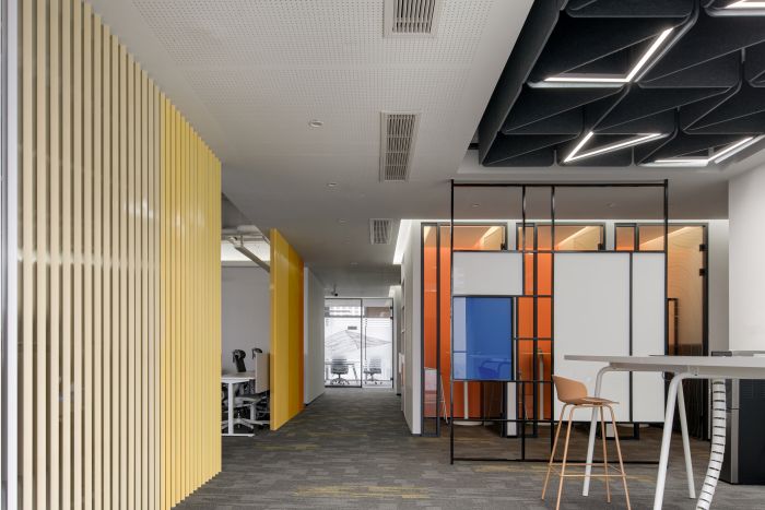 前臺空間使用了白色大理石材質(zhì),整體風(fēng)格簡潔優(yōu)雅。空間右側(cè)使用企業(yè)的品牌色黃色和橙色設(shè)置了一個(gè)線條隔斷,用于分隔入口區(qū)域和辦公區(qū),保護(hù)企業(yè)辦公空間的隱私。空間讓來訪者感覺流暢現(xiàn)代,同時(shí)也充滿了企業(yè)的個(gè)性。