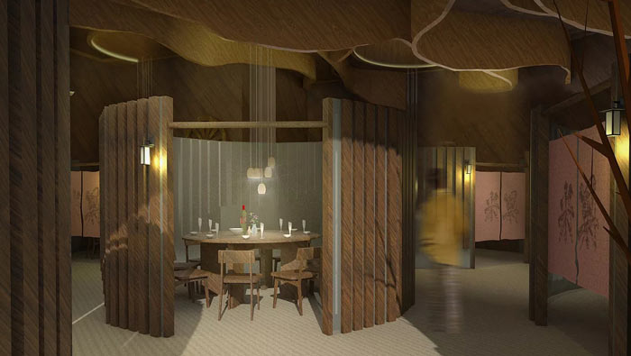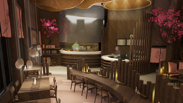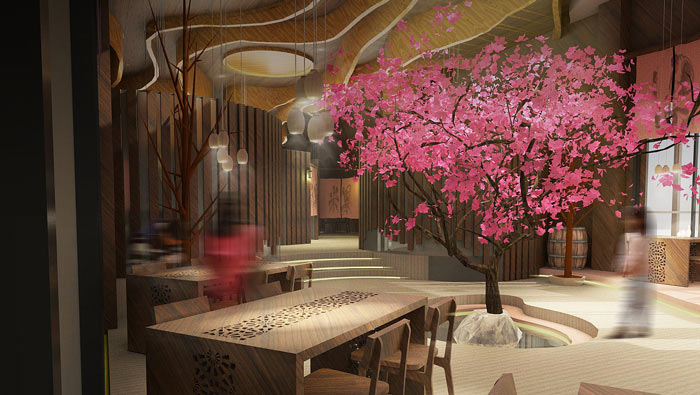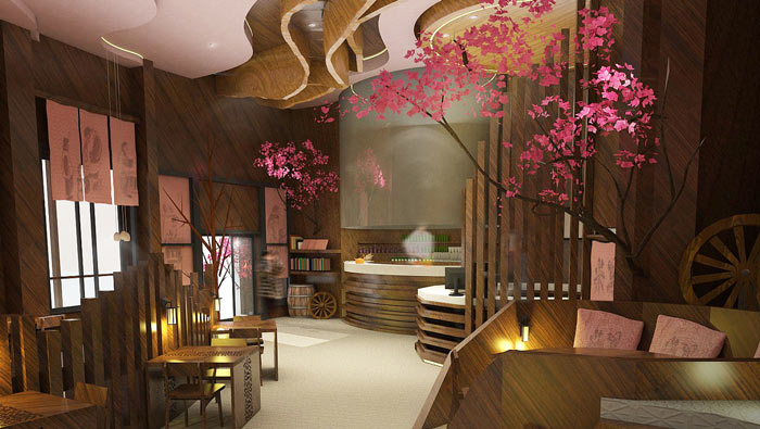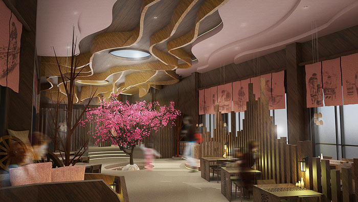 特色風味餐廳氛圍設計:在餐廳的中央有一顆桃花盛開的桃樹,客戶不管在哪里就餐,都可以看到這美好的一面,這也是設計師給客戶的福利,讓桃花朵朵香成為一種享受。