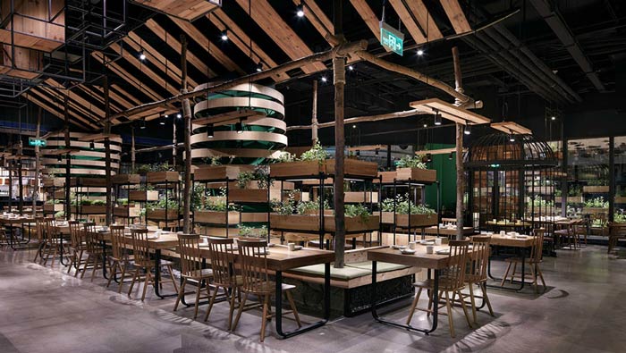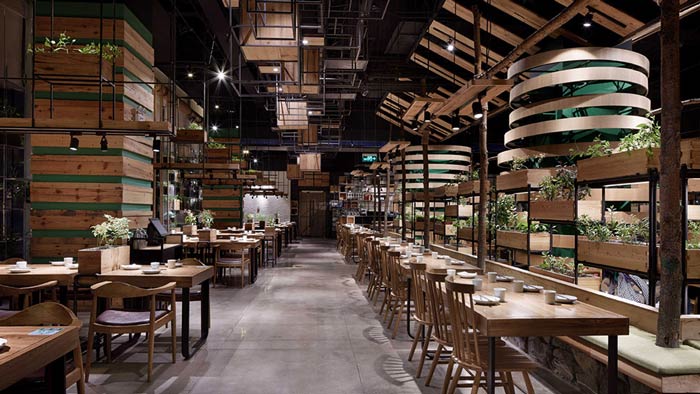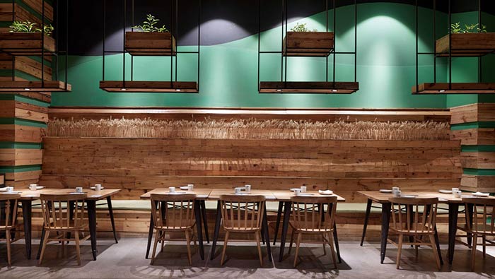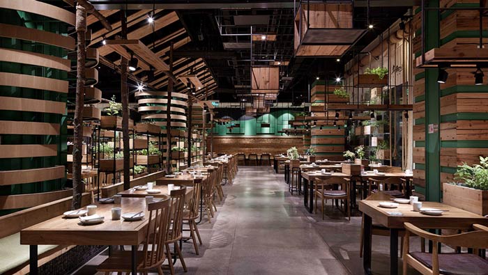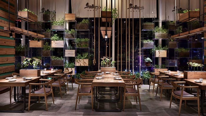 特色生態餐廳餐區設計:空間中的各類蔬菜,有的結合柜臺、有的連接天花板、有的長滿墻面,各式各樣的蔬菜,為空間增加了活力,也成為餐廳的特色之一,吸引客戶慕名而來。