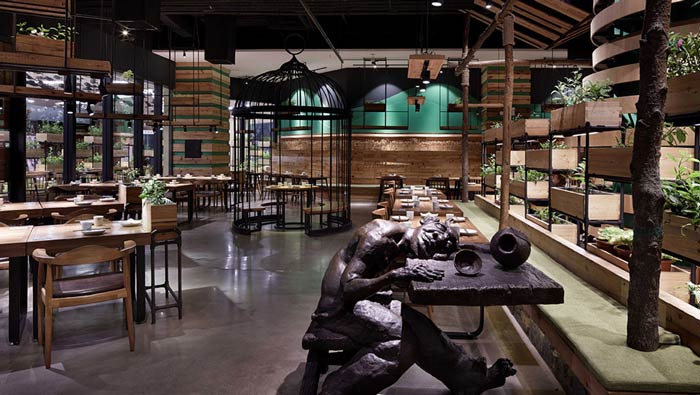 特色生態餐廳餐區設計:這里集結了藝術雕像、枯山水、有機蔬菜吧、有機大豆石磨區等等,最后匯集在餐廳的各個區域,這樣的就餐環境,讓客戶在就餐時猶如在農場之中。