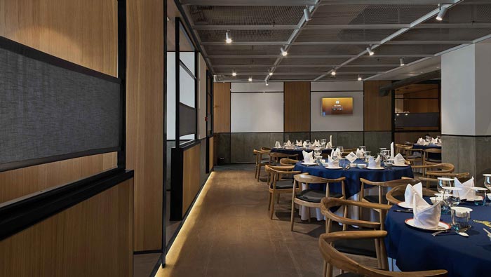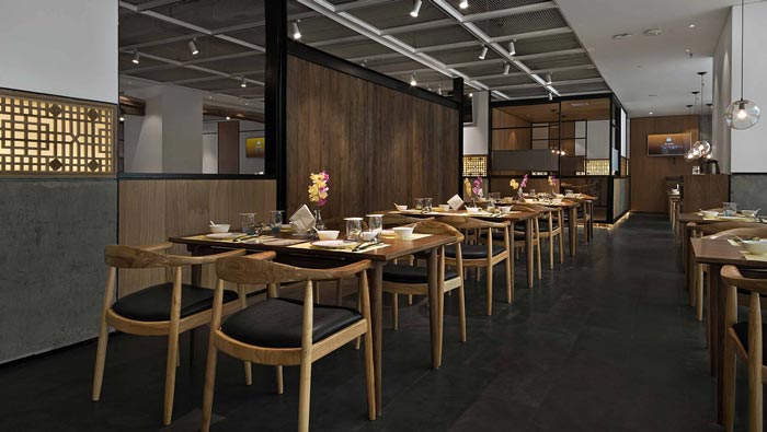 特色川菜館廚房餐區設計:設計師在廚房外圍的周邊,打造了一處直角餐區,客戶可以邊就餐,邊看到廚房的情況,讓客戶吃的放心、吃的安心,同時也為餐館營造了10個餐位。