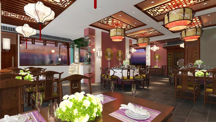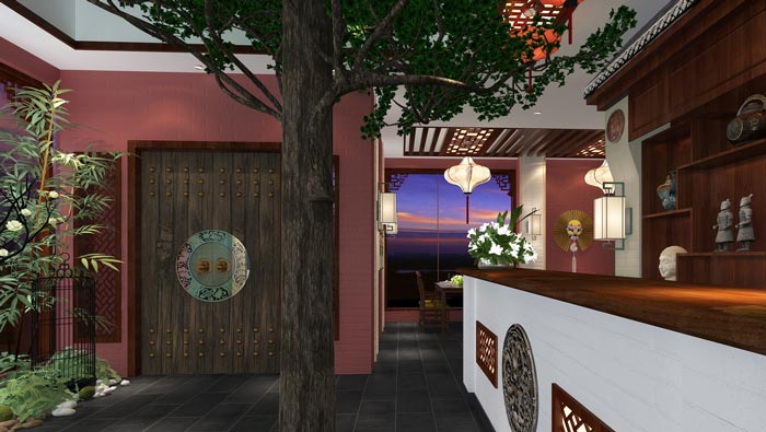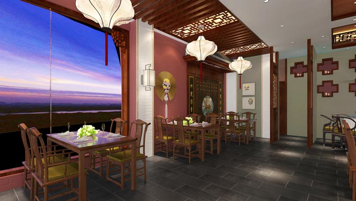 川菜館進門區裝修設計:客戶進入餐館后,空間給客戶的第一感覺就是鳥語花香,這意境、這景色、這氛圍,給客戶一個不錯的第一感覺,讓客戶喜歡這里,是設計的第一考慮。