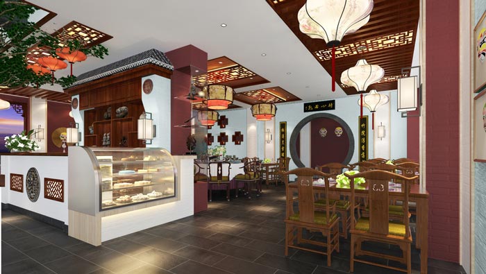 川菜館甜品區裝修設計:甜品受到很多人的喜愛,業主將其安置在這里,是做為贈送之用,當吃飯之后,吃些甜品會讓人有一種幸福的感覺,種類雖不多,但卻都具有代表性。