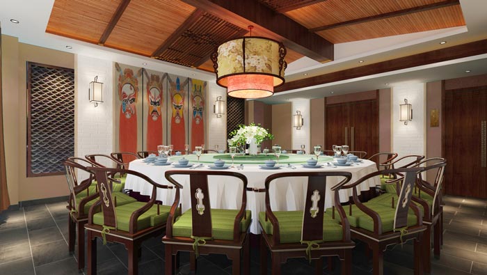 川菜館10人包廂裝修設計:這里適合家人間的聚餐,左邊描述的是一個大宅門的門口,這其中本身家族的韻味就非常濃郁,家庭、家族之間的紐帶,讓空間極具家的溫暖。