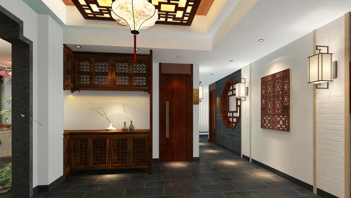 川菜館二樓玄關裝修設計:客戶經過樓梯進入玄關,經過玄關進入客房,一環套一環,古色古風的設計在空間中延續,目的就是空間有一種,自始至終的感覺,給客戶以安心。