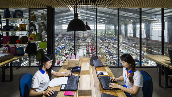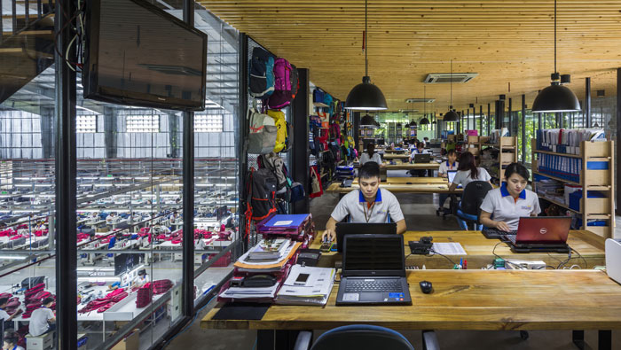 服裝廠房二樓辦公區(qū)裝修設計:整個空間沒有采用任何隔斷墻、或封閉的房間進行隔離,目的就是希望打造一個開放式的空間,旨在減少車間工作人員的壓力,讓空間宛若一體。