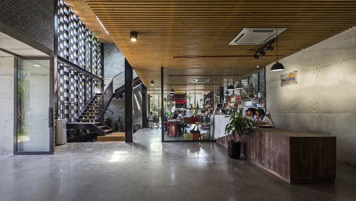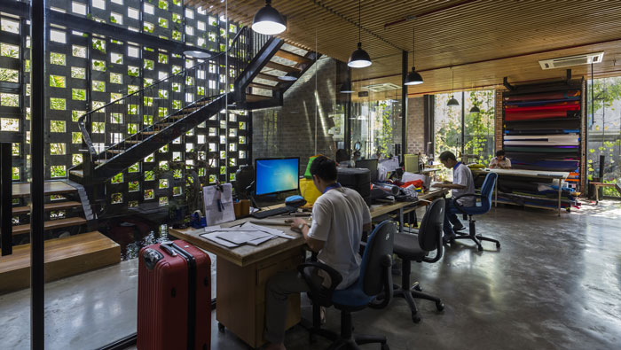 服裝廠房二樓辦公區(qū)裝修設計:綠色在整個空間隨處可見,這都歸功于外界的綠植藤蔓,這些天然的綠植,將空間裝扮得自然、舒適,這也正是自然的魅力,廠區(qū)與自然和諧相處。