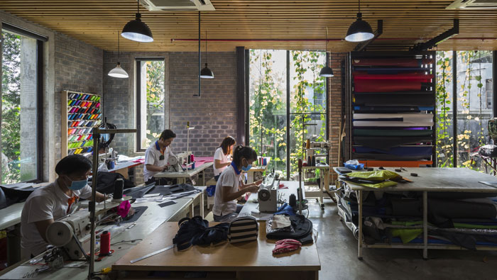 服裝廠房墻體裝修設計:通透是此類建筑的初心,通保證室內(nèi)與室外空氣的流通,透保證陽光透過這里進入室內(nèi),這樣相互之間的互動,產(chǎn)生了一個通風、自然、舒適的空間。