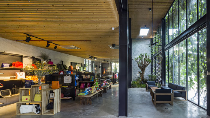 服裝廠房外墻裝修設計:外墻的綠植充滿了自然的氣息,此自然是天生地長的自然,其中只有人為修剪、整理的成分,之所以這樣,是設計師希望一切都可以保留最初的模樣。