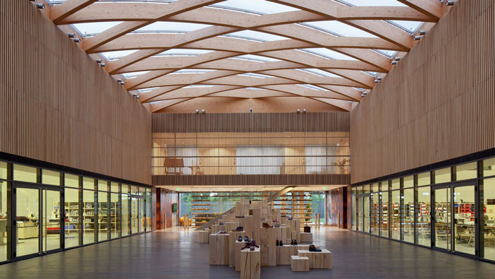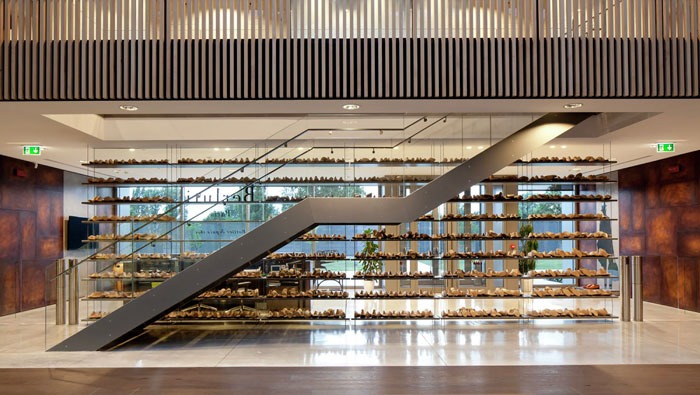 工廠廠房大堂裝修設計:進入大堂后,可以看到這里擺放著各式各樣的樣板鞋,這里既做為展示區,同時也做為樣板區,一個區域多個功能,正是設計師對功能區域的定位。