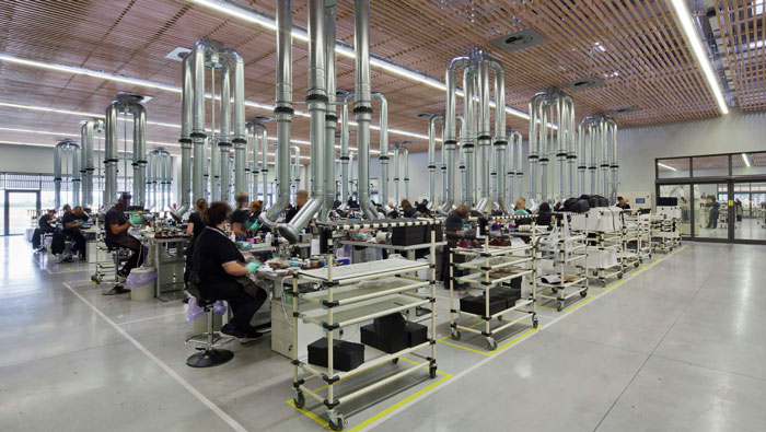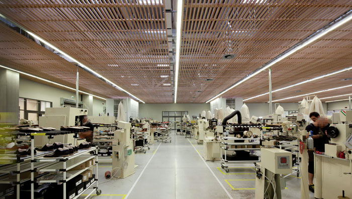 工廠廠房車間裝修設計:這里是鞋子的重要組裝區,這里主要由人工完成,高端的鞋子在這里逐漸成型,這里注重的是舒適度,在定制化回歸的今天,高端的鞋子更受人追捧。