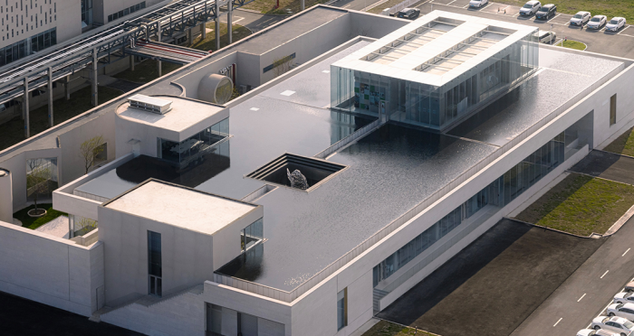 這是一個新能源材料行業(yè)的工業(yè)廠區(qū)的設(shè)計案例。廠區(qū)建筑以水為主題,水上的漣漪仿佛叩響生命與物質(zhì)的存在邊界。生產(chǎn)車間的發(fā)酵恒溫水排走之前,在辦公區(qū)屋頂匯成淺池。