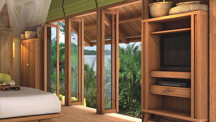 客房窗戶的設計:我們可以坐在木地板上眺望湖水,看著那沒有被污染的純凈湖水、看著那生長繁茂的各樣植物,在這里我們仿佛重活了新生,在這里我們仿佛回到了那遙遠的古代,在這里我們不再是鋼筋水泥中的一員,而是一個獨立的生命體,在這樣我們的心靈得到解放。