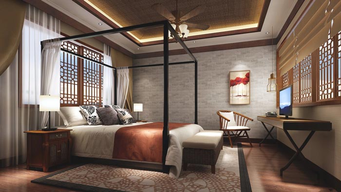 D類客房的設計:此處是為文雅之士準備的,當然夫妻、戀人都可以在此處,在設計師看來每一個人出來旅游,都不僅僅只是看風景,而是尋找心中的寧靜,故此設計師縱覽中華文化的歷史,感受到古人對于心的修煉值得我們現代人借鑒,此處的格局設計頗具古時之風。