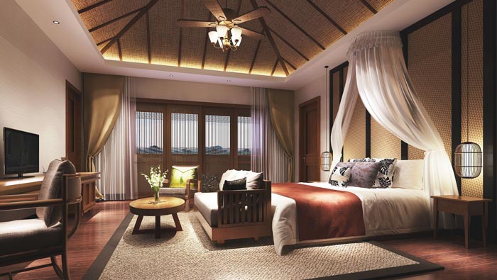 A類客房的設計:對于辛苦一天的游客來說,軟軟的床、溫馨的空間正是他們需要的,在此處客戶可以稍作休息與調整,之后客戶打開木窗可以直接眺望到遠方的群山,讓人可以足不出戶就可以欣賞到美景,這正是設計師給客戶準備的禮物。