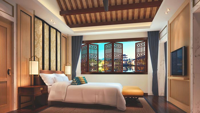 C類客房的設計:此處的內部搭配相對簡潔一些,這是由于外部景觀所決定的,相信大家透過窗戶可以看到對面的靈臺樓閣,設計師在此處希望讓客戶感受到的正是外部的景色,客戶站在窗邊、坐在床上、躺在床上,以不同的姿勢去欣賞外部的風景,得到的體驗也是完全不同的。