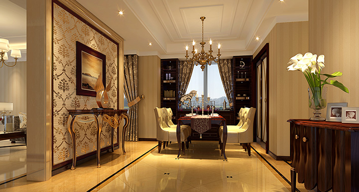 設(shè)計(jì)理念:以白色調(diào)和深啡色調(diào)為大對比色彩,加以簡約形態(tài)的暖色家具為中間色來諧調(diào),營造一種高貴雅致對比的深度感的空間。將歐洲新古典風(fēng)格演繹成一種優(yōu)雅的平衡姿態(tài),含蓄、考究的家居空間