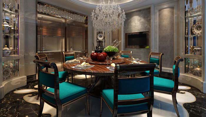 自然中,曲線最美,設計師把它運用到餐廳上。圓的天花,曲線地花,曲線大理石飾柜等,令整個空間自然流暢。