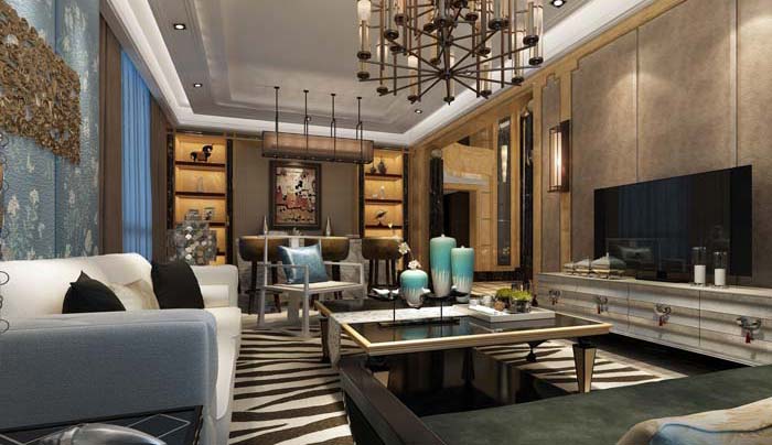 客廳地面天花采用米黃大理石表現奢華,也有黑色低調。皮革質感背景中和客廳的高冷。