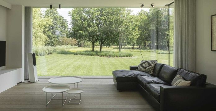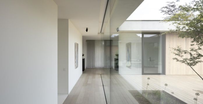 底層的支撐底座是由一種混凝土外觀的平灰泥突出的。在上面的較小體積是在木箱和包層上實現的。然而,這兩卷在物化上的差異似乎不難對比。畢竟,灰泥是以淺灰色進行的,它的底土和一種特殊的清掃技術也使灰泥具有溫暖的色調。這樣做,某些等級出現,使整體看起來不那么平坦,更自然。這與大窗戶結合在一起,產生了美麗的和諧。