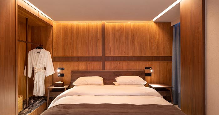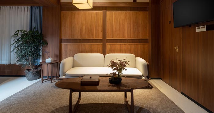 本次為民宅民宿設計項目,在設計中保留原建筑的柱網空間,同時以院落為中心,將空間劃分為四個客房區域,整體呈現中軸對稱的格局。