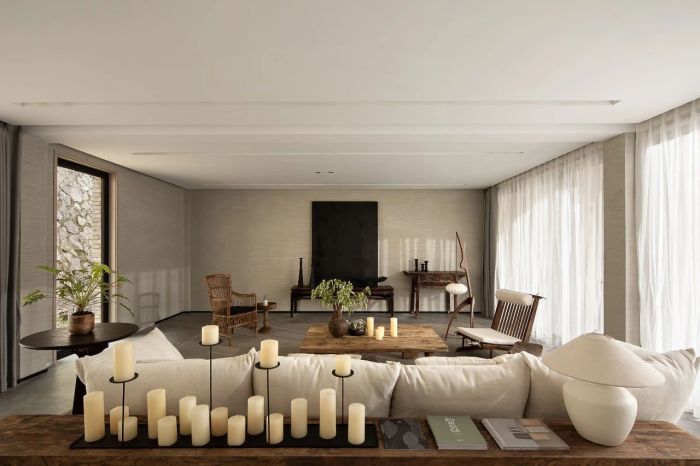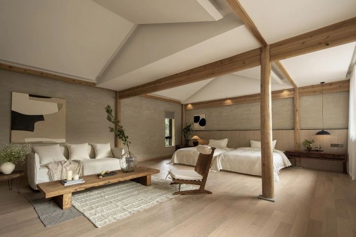 在保留傳統的古村落的外貌特色的基礎上,形成了現代與傳統結合的建筑風貌。整個建筑體就地取材,采自山間的石塊砌成墻面,夯土固定表面,黑色瓦片蓋成屋頂,一磚一瓦間都有著歷史的記憶。原本建筑屋檐與梁柱結構也被保留,帶來古色古香又極具現代化特色,浸潤其中能夠感受到時間與文化的沉淀,仿佛擁有著煥然新生的生命力。