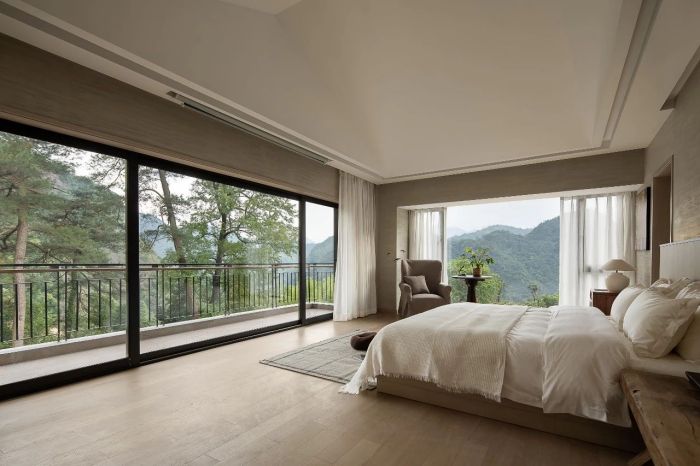 在浙江省武義縣東南部,小黃山景區以奇松、怪石、云海、飛瀑聞名,被稱為"四絕",一面是黃山般的懸崖絕壁,一面是漓江般的峽谷溪澗,四目所及都是絕美風景。自在山谷民宿便隱匿于山林深處。結合地形的差異,設計師在平面布局上進行合理規劃,錯落變化的房屋讓視野變得開闊,盡最大可能地看到室外的美景,整個民宿也如原本的古村落般此起彼伏,讓設計于無形中融入自然。